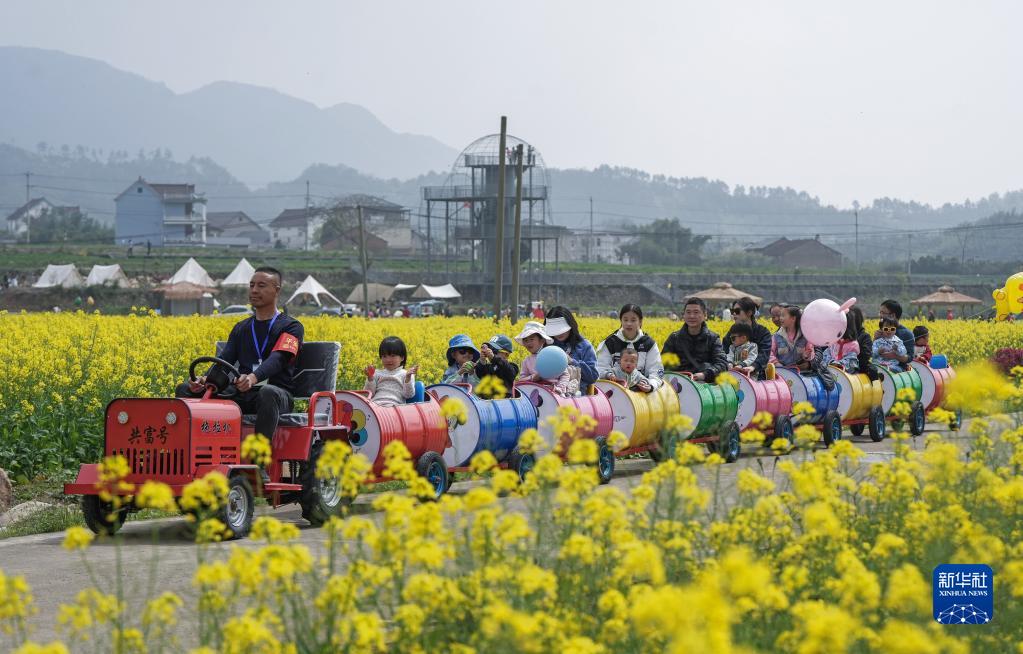 在浙江杭州臨安區青山湖街道郎家村“共富稻田”,游客乘坐田野小火車(chē)在油菜花地里感受春日美景(4月1日攝)?!肮哺坏咎铩倍ㄎ欢喙δ芴飯@農旅綜合體,陸續打造了妙哉花園、稻田觀(guān)光道、稻田餐廳、稻田茶吧等鄉村旅游特色節點(diǎn),吸引城市居民前來(lái)體驗戶(hù)外農田生活。