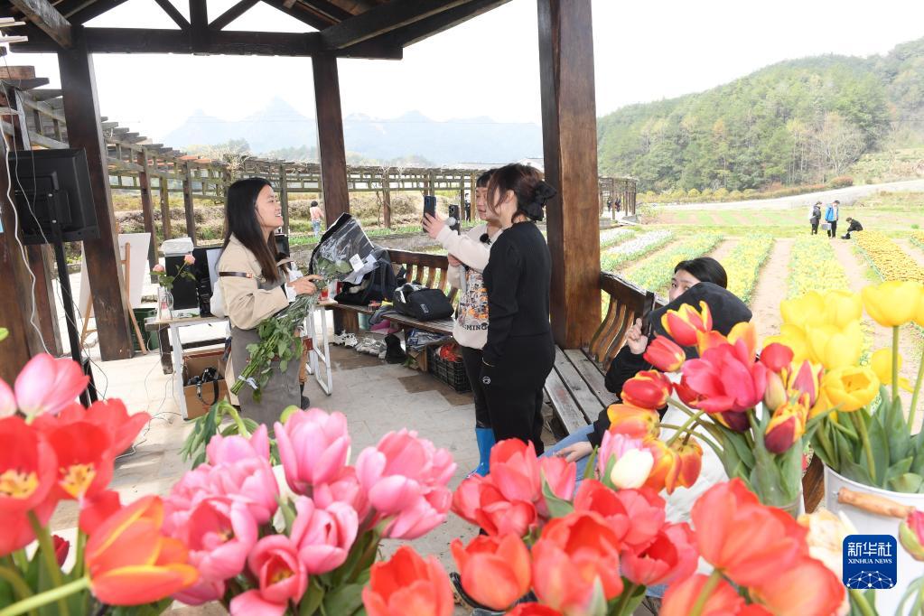 主播在浙江金華浦江縣杭坪鎮烏漿村的花海間直播賣(mài)花(3月28日攝)。