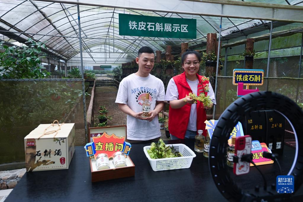 在浙江諸暨東白湖鎮的鐵皮石斛有機種植基地,東白湖鎮黨員志愿者(右)和基地負責人一起直播銷(xiāo)售鐵皮石斛花茶、鐵皮石斛酒等產(chǎn)品(6月8日攝)。近年來(lái),東白湖鎮著(zhù)力發(fā)展鐵皮石斛等特色農業(yè)產(chǎn)業(yè),加快農業(yè)數字化轉型,推進(jìn)農特產(chǎn)品交易服務(wù)中心、惠農綜合平臺以及直播經(jīng)濟的發(fā)展。