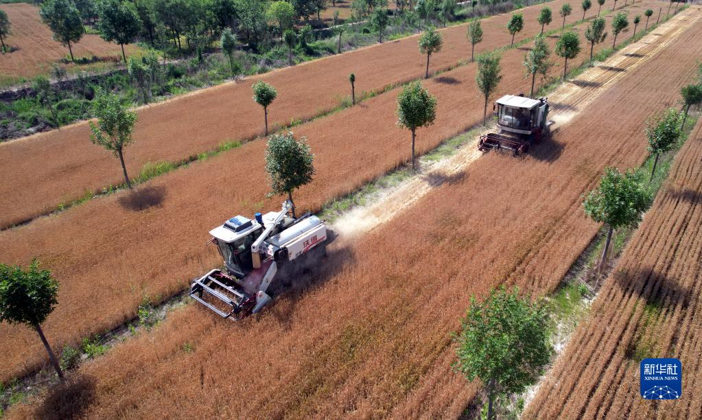 6月11日,在山東省濱州市沾化區泊頭鎮陳家村家庭農場(chǎng),小麥聯(lián)合收割機在田間進(jìn)行黑小麥收割作業(yè)。