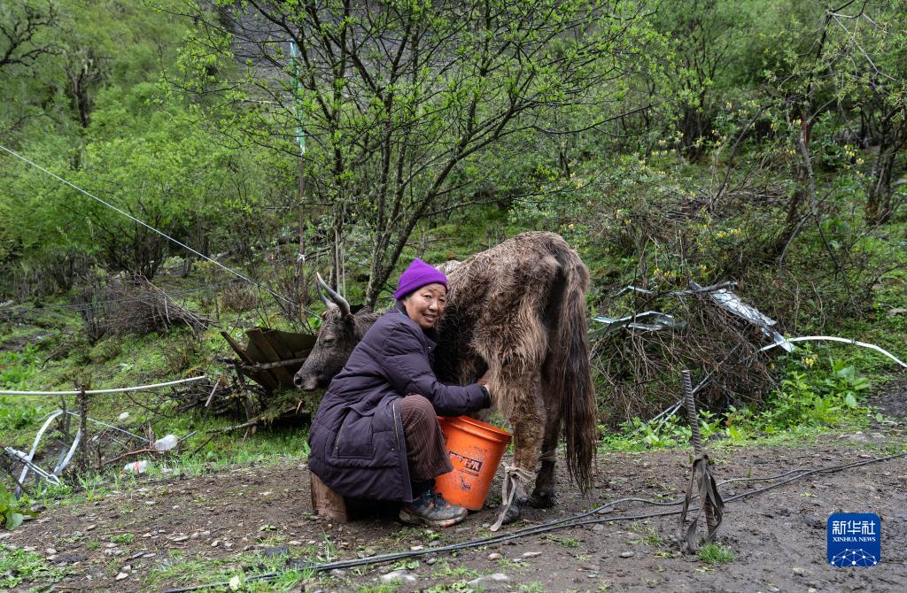 6月10日,央宗在牧場(chǎng)擠奶。