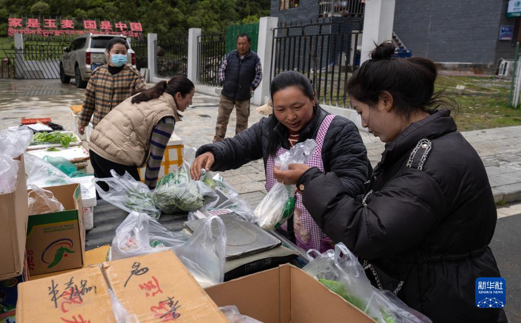 6月10日,來(lái)自隆子縣的商人肖女士(右二)向玉麥鄉的居民售賣(mài)水果和蔬菜。肖女士一個(gè)星期過(guò)來(lái)一趟。