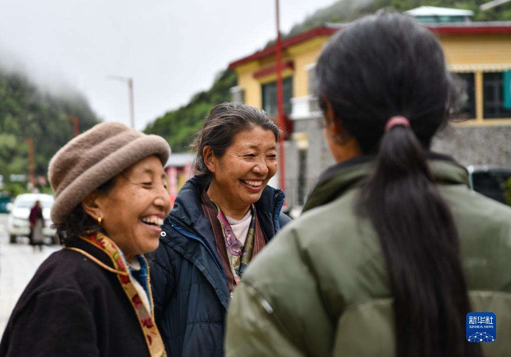 卓嘎(左)和央宗在玉麥鄉街頭與人聊天(6月10日攝)。