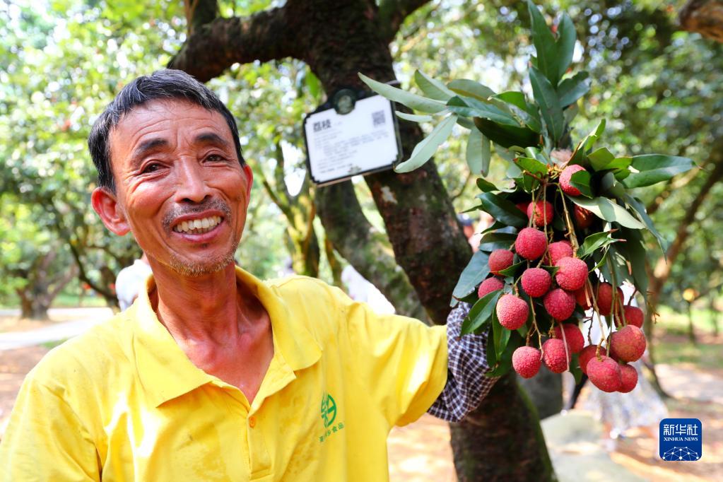 6月12日,在廣東茂名高州市根子鎮柏橋村荔枝種植園,一位果農展示從樹(shù)齡約1300年的“天倫之樂(lè )”古樹(shù)上采摘的荔枝。