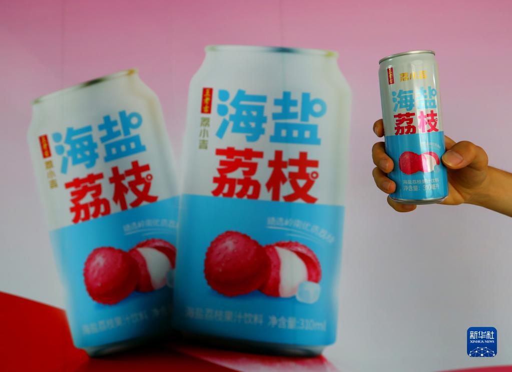 這是6月12日在廣東茂名的廣藥王老吉廣東荔枝(茂名)產(chǎn)業(yè)園拍攝的荔枝果汁飲料(左側為海報,右側手中為實(shí)物)。這里的荔枝清汁生產(chǎn)線(xiàn)每天可處理200噸荔枝鮮果。