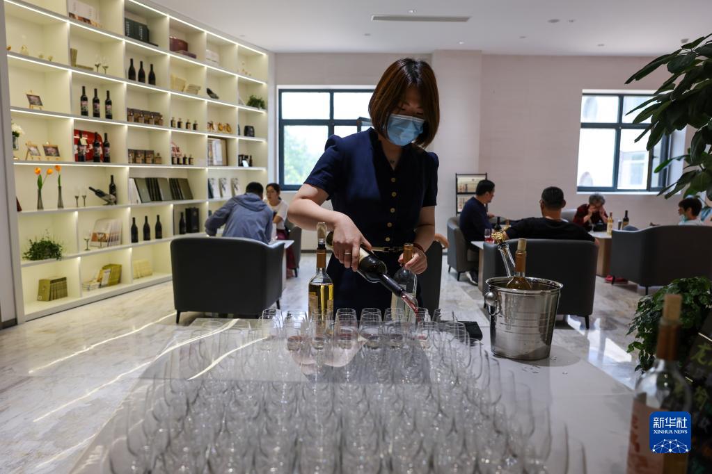 6月12日,張裕酒文化博物館工作人員為游客準備品鑒用的葡萄酒。