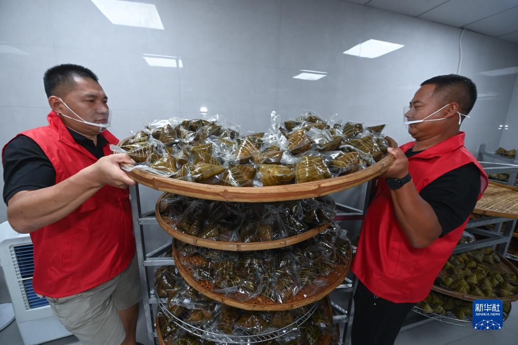 6月13日,在杭州市富陽(yáng)區湖源鄉窈口村的“源享共富工坊”內,黨員志愿者在搬運灰湯粽。