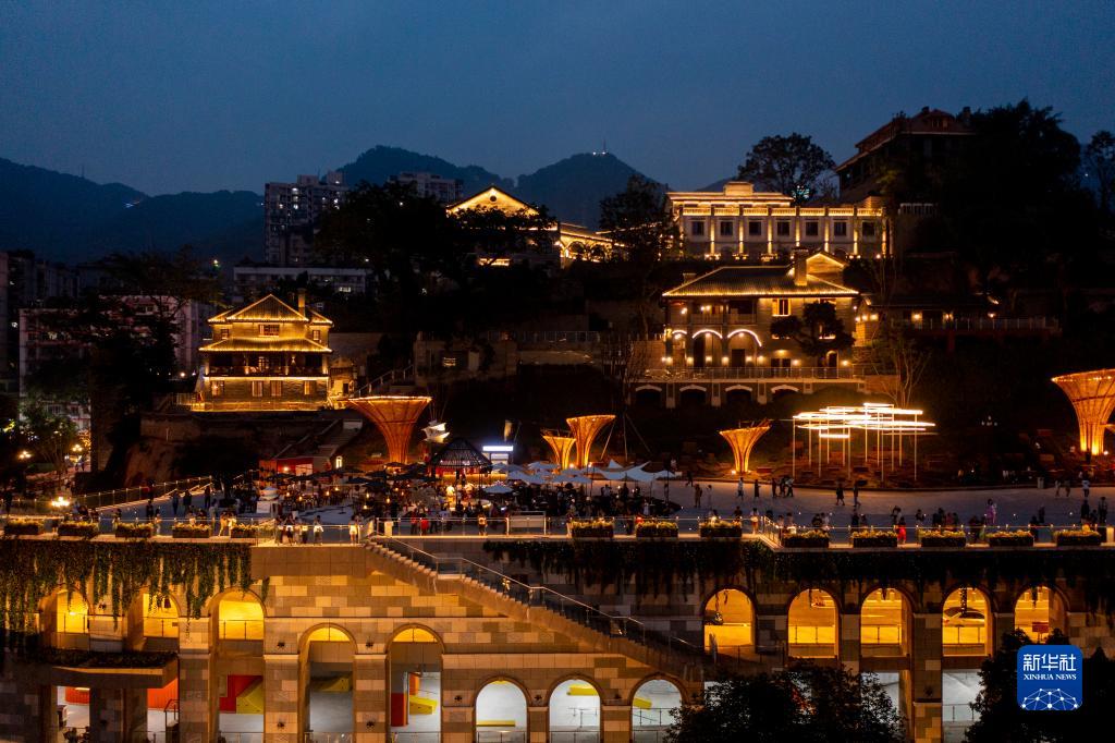 6月9日拍攝的重慶南岸區南濱路上的重慶開(kāi)埠遺址公園夜景(無(wú)人機照片)。