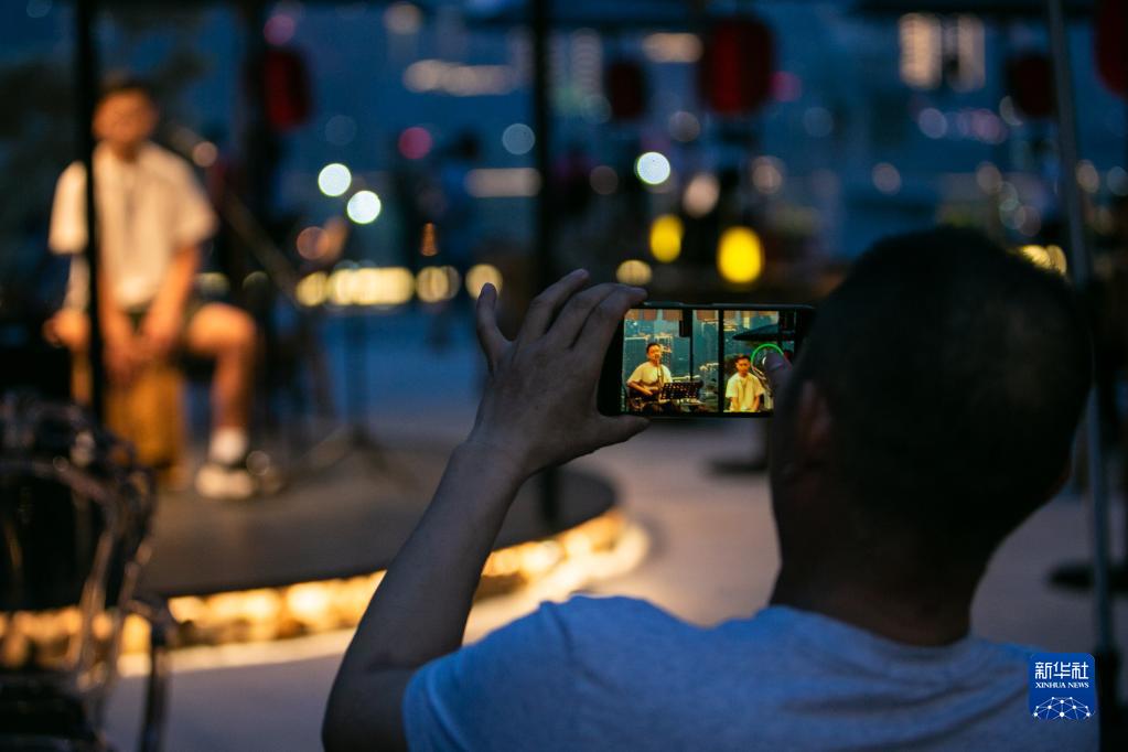 6月9日,在重慶市南岸區,游客在重慶開(kāi)埠遺址公園的觀(guān)景平臺上欣賞音樂(lè )表演。