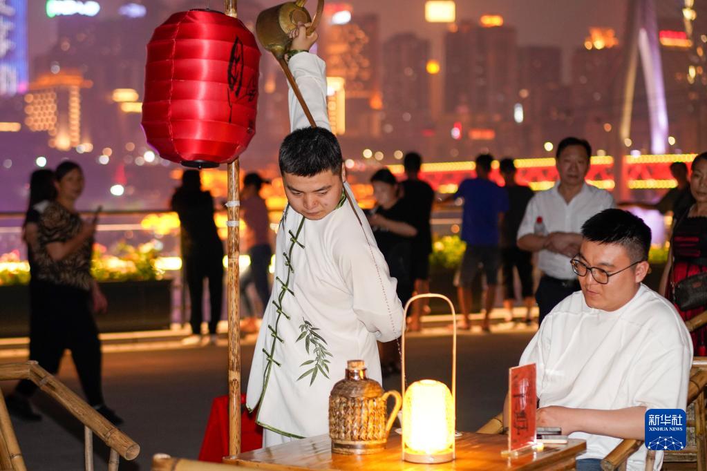 6月9日,重慶開(kāi)埠遺址公園的觀(guān)景平臺上,游客們在一邊欣賞重慶夜景,一邊感受茶藝表演。