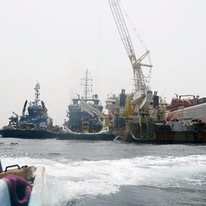 這是6月12日在也門(mén)荷臺達附近海域拍攝的“薩菲爾”號油輪和聯(lián)合國工程船。