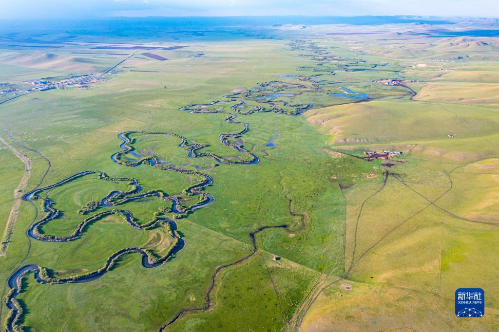 初夏時(shí)節,位于內蒙古自治區錫林郭勒盟東北部的烏拉蓋草原風(fēng)景宜人,蔚藍色的天幕下,綠色的草原廣闊無(wú)垠,蜿蜒流淌的烏拉蓋河綿延向遠方,美如畫(huà)卷。