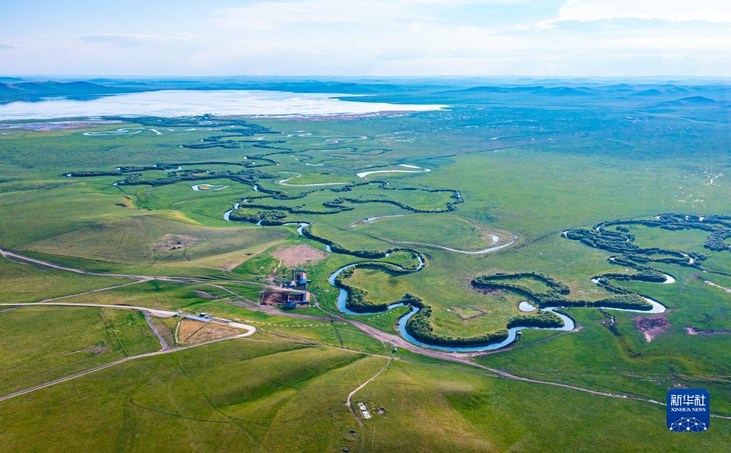 初夏時(shí)節,位于內蒙古自治區錫林郭勒盟東北部的烏拉蓋草原風(fēng)景宜人,蔚藍色的天幕下,綠色的草原廣闊無(wú)垠,蜿蜒流淌的烏拉蓋河綿延向遠方,美如畫(huà)卷。