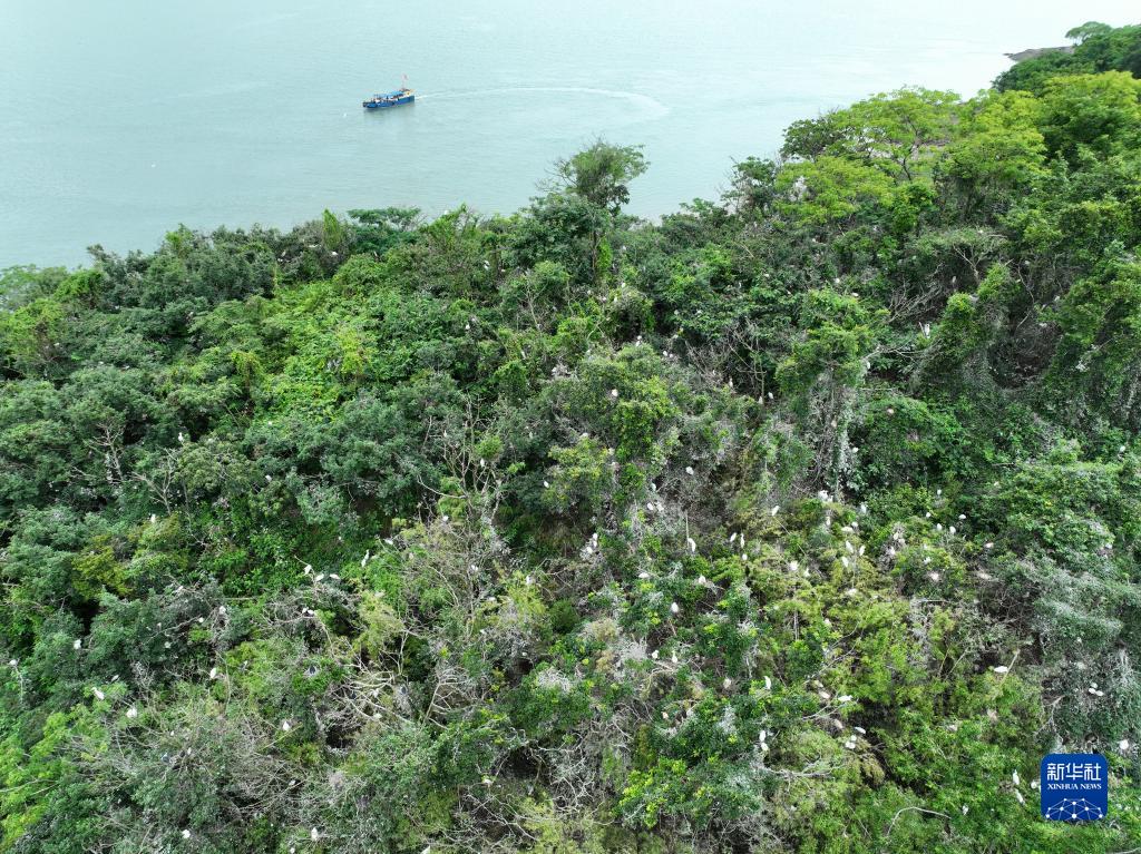 6月13日,海島護鳥(niǎo)隊行駛過(guò)一座棲息有大量野生鳥(niǎo)類(lèi)的島嶼(無(wú)人機照片)。