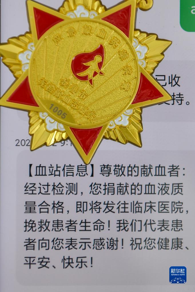 這是一位RH陰性血無(wú)償獻血志愿者展示的獎?wù)潞脱杭磳⑼度肱R床使用的回執短信(6月13日攝)。