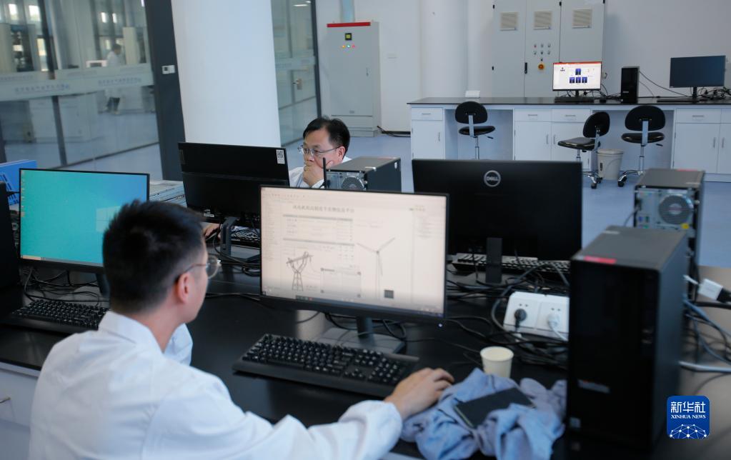 在江蘇射陽(yáng)港零碳產(chǎn)業(yè)園,工作人員在海上風(fēng)電大功率裝備研發(fā)中心收集數據(6月13日攝)。