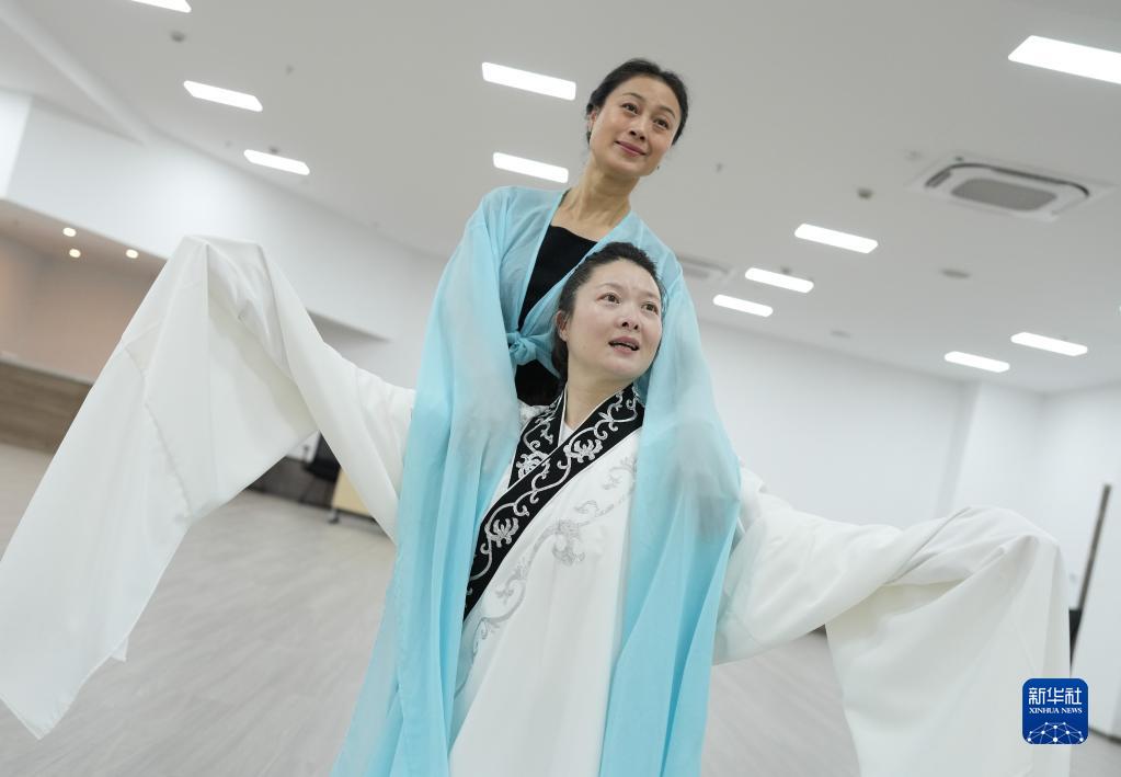 在位于杭州的浙江越劇團,演員謝莉莉(上)和汪喜喜在排練講述宋代詞人的新編越劇《張玉娘》(6月9日攝)。