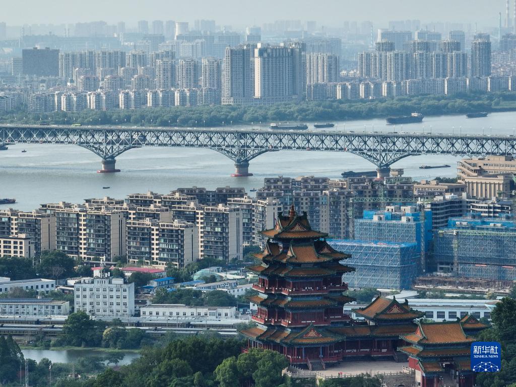 南京閱江樓與南京長(cháng)江大橋(6月11日攝,無(wú)人機照片)。