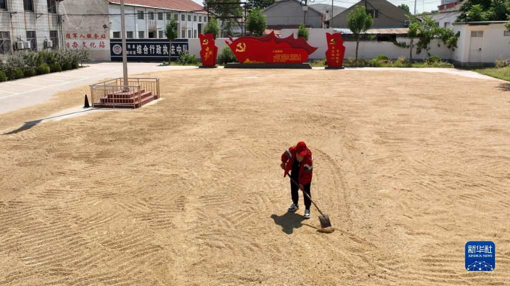6月13日,村民在陽(yáng)信縣金陽(yáng)街道辦事處辦公樓前晾曬小麥(無(wú)人機照片)。