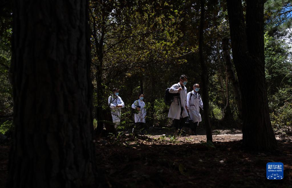 6月12日,王振疆(右一)、王彤旭(右二)、陳冰(右三)和尼瑪益西在樹(shù)林間行走。