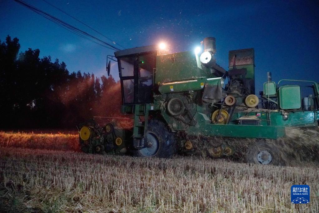 6月13日,在山東省臨邑縣臨盤(pán)街道,聯(lián)合收割機在夜間進(jìn)行麥收作業(yè)。