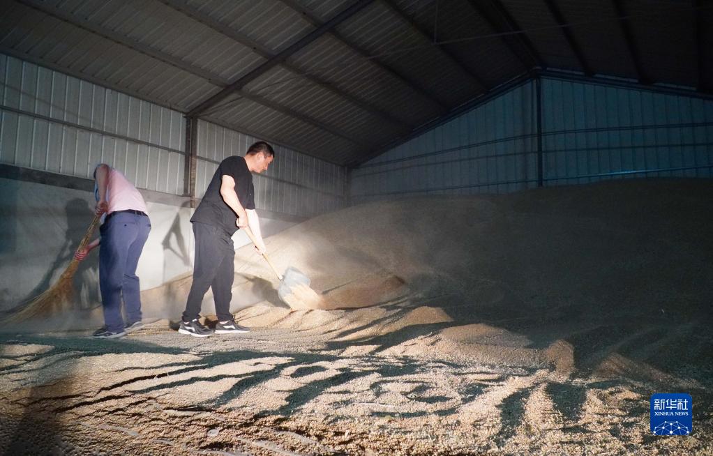 6月13日晚,在山東省臨邑縣臨盤(pán)街道,農戶(hù)在糧倉內存儲收獲的麥子。