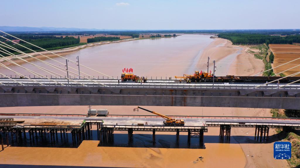 6月14日,在濟鄭高鐵山東段長(cháng)清黃河特大橋,中鐵十局的工作人員進(jìn)行鐵軌鋪設作業(yè)(無(wú)人機照片)。
