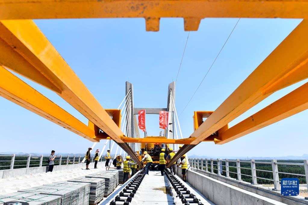 6月14日,在濟鄭高鐵山東段長(cháng)清黃河特大橋,中鐵十局的工作人員進(jìn)行鐵軌鋪設作業(yè)。