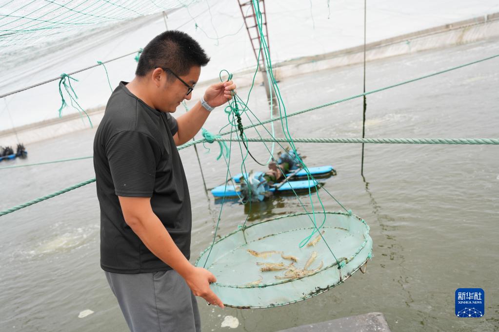 6月14日,在蛇蟠島上的一家水產(chǎn)養殖企業(yè),工作人員在養殖對蝦的小棚內檢查對蝦生長(cháng)狀況。