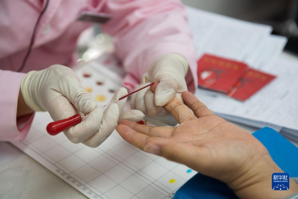 6月14日,在寧夏銀川市新華街愛(ài)心獻血車(chē)內,醫務(wù)人員為獻血者進(jìn)行血樣檢測。