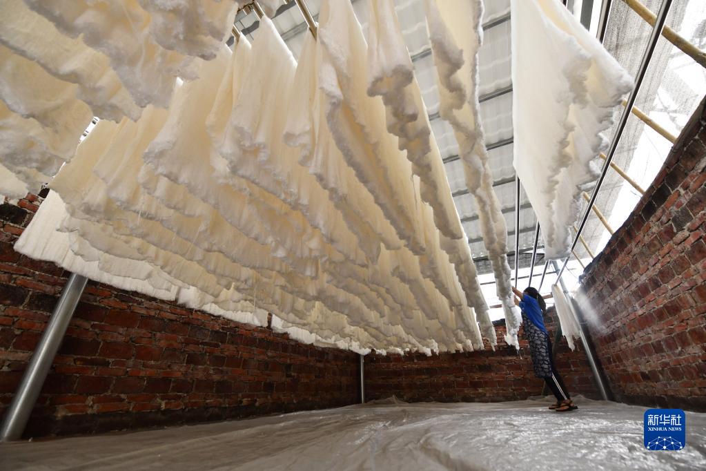 6月14日,在鹿寨縣黃冕鎮山腳村蠶絲被加工廠(chǎng),村民在曬絲。