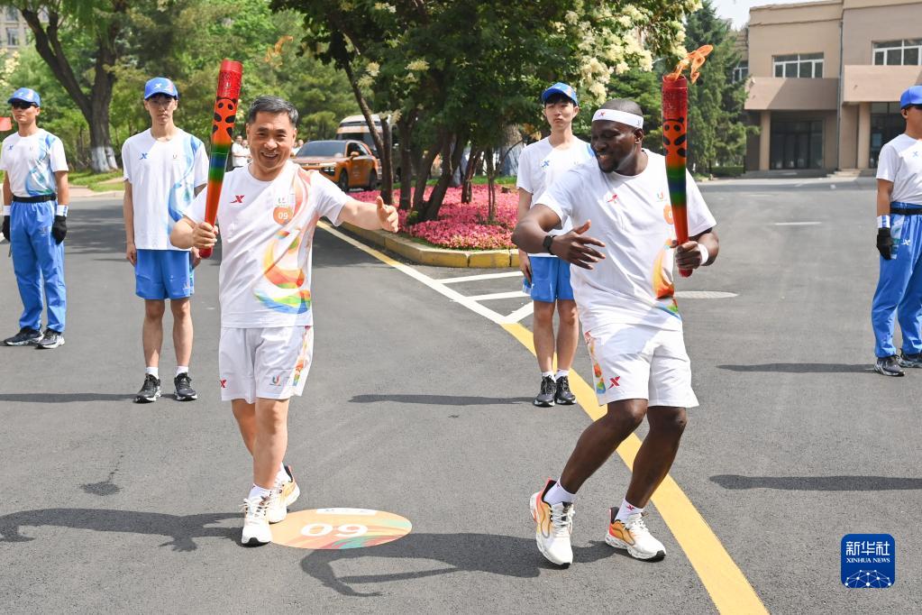 6月15日,火炬手馬軍(前左)與樂(lè )古在火炬傳遞中交接。