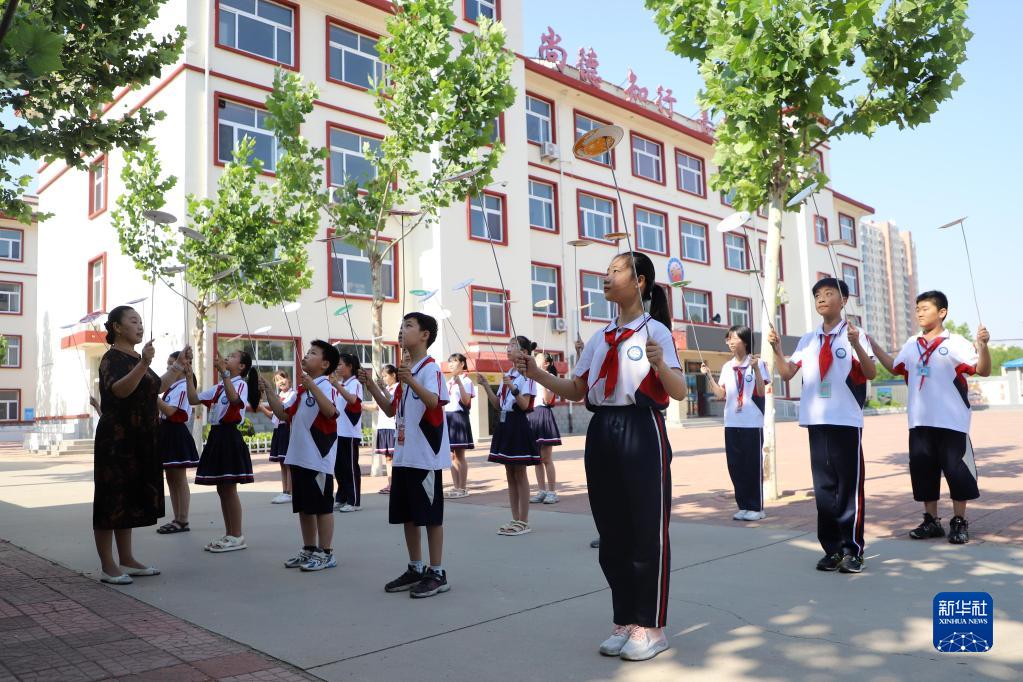 6月15日,在河北省滄州市吳橋縣新興路小學(xué),老師指導學(xué)生練習雜技轉碟。
