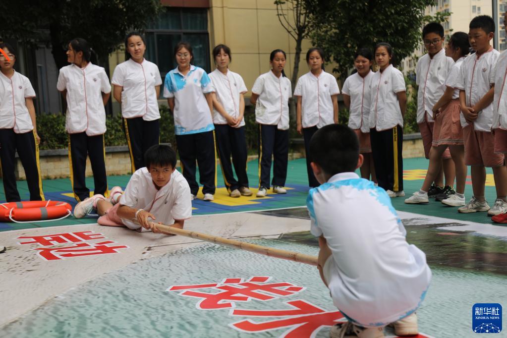 6月15日,在南昌二十八中灣里實(shí)驗學(xué)校,老師在戶(hù)外指導同學(xué)們進(jìn)行淺水區竹竿救援實(shí)操。