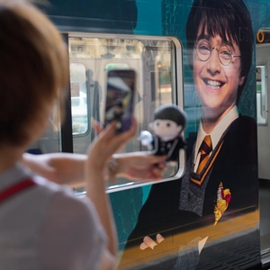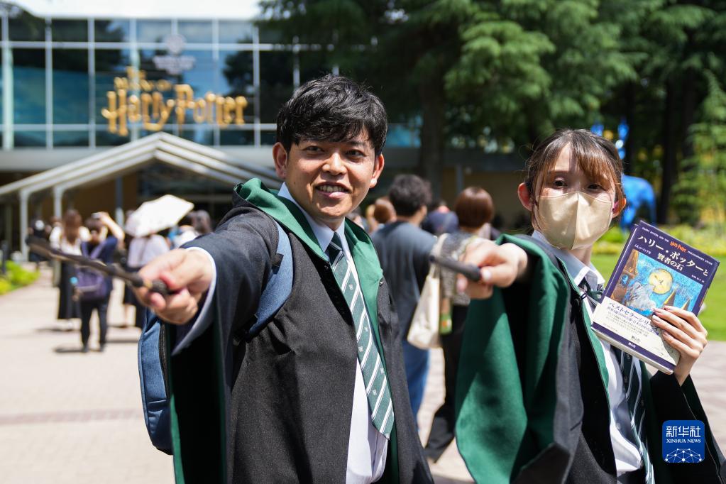 6月16日,游客在日本東京哈利波特主題公園內合影。