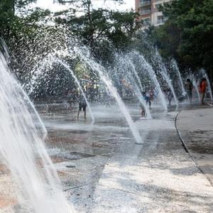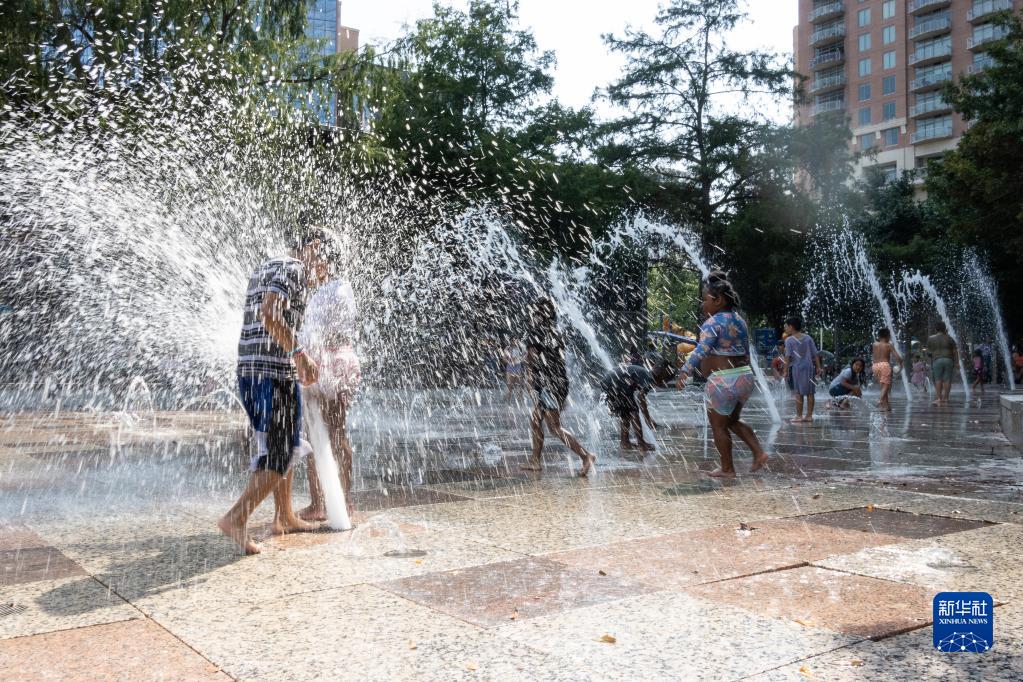 6月15日,孩子們在美國休斯敦市一處噴水公園玩耍消暑。