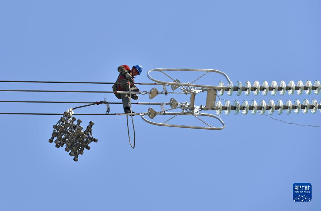 6月15日,在凌綏高速電力線(xiàn)路遷改工程現場(chǎng),國家電網(wǎng)遼寧朝陽(yáng)供電公司工程技術(shù)人員安裝線(xiàn)上間隔棒。
