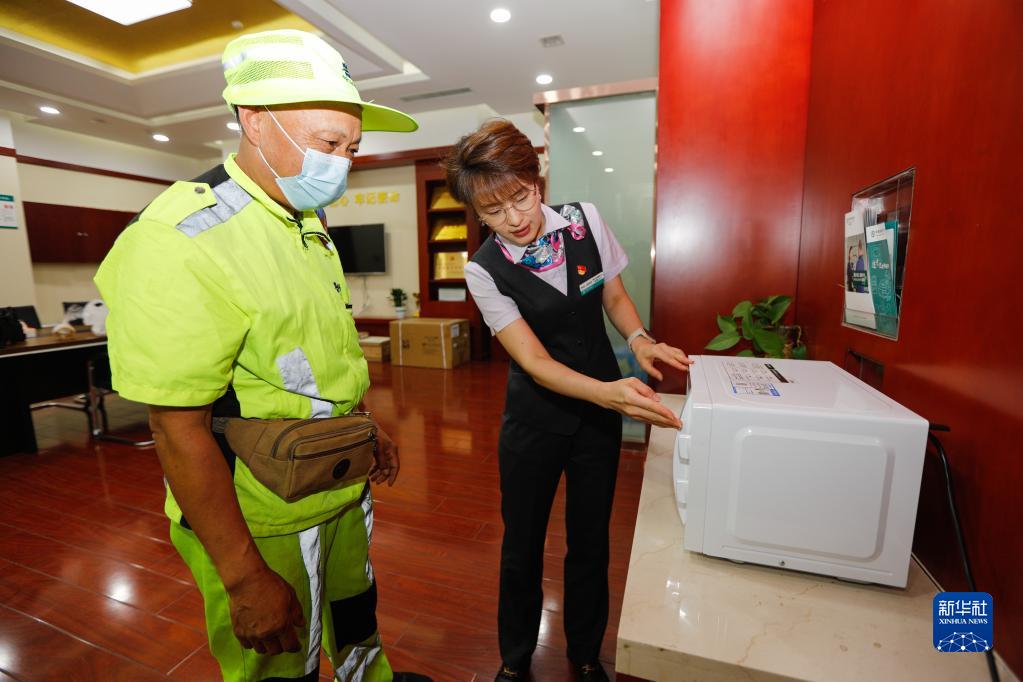 6月16日,在山東濟南的中國農業(yè)銀行濼源支行“濃情暖域·工會(huì )戶(hù)外勞動(dòng)者服務(wù)站點(diǎn)”,工作人員指導環(huán)衛工人使用微波爐。