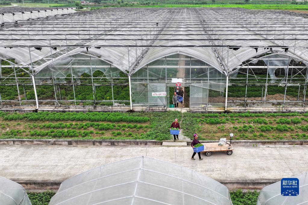 6月16日,村民在貴州省黔東南苗族侗族自治州黃平縣舊州鎮野菜種植基地采收野菜(無(wú)人機照片)。