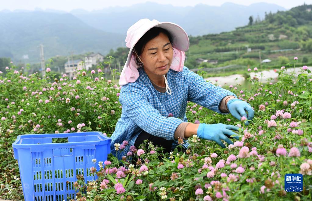 6月16日,村民在貴州省黔東南苗族侗族自治州黃平縣舊州鎮野菜種植基地管護綠肥三葉草。