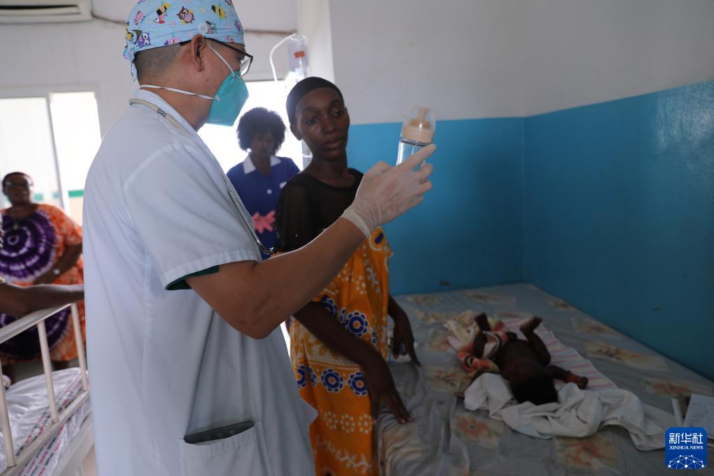 6月14日,在赤道幾內亞首都馬拉博的馬拉博地區醫院,中國醫療隊兒科醫生李木勝與患兒母親交流。