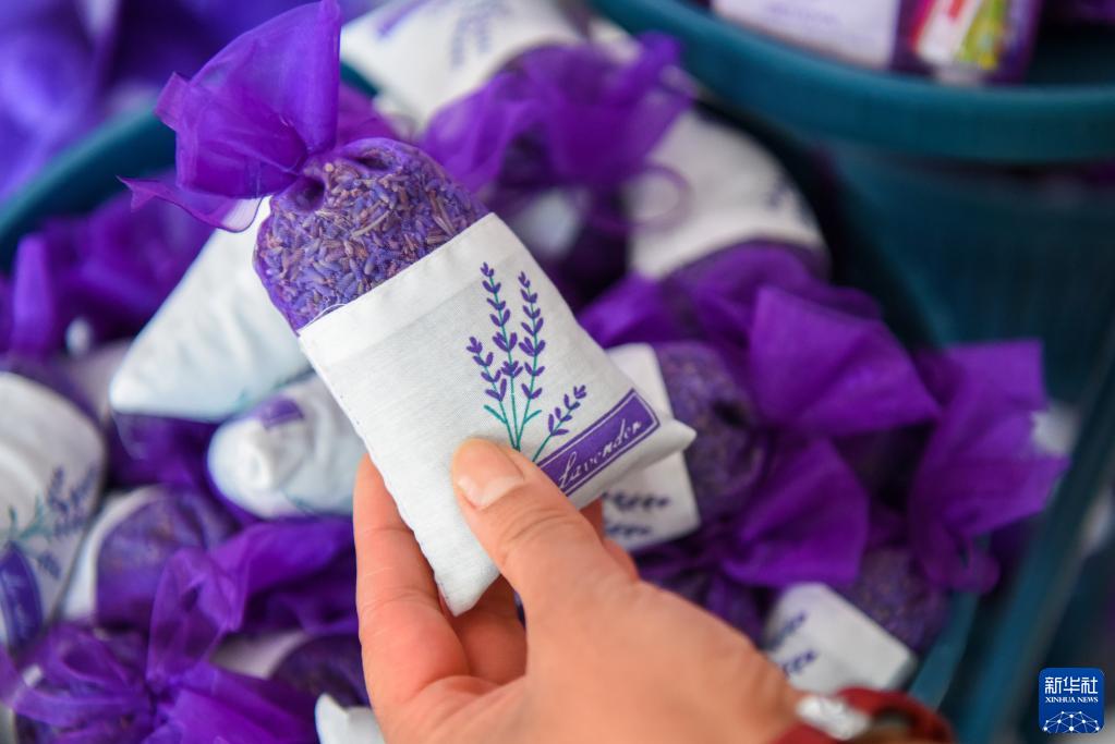 在位于新疆霍城縣蘆草溝鎮四宮村的解憂(yōu)公主薰衣草農場(chǎng),游客選購薰衣草產(chǎn)品(6月16日攝)。