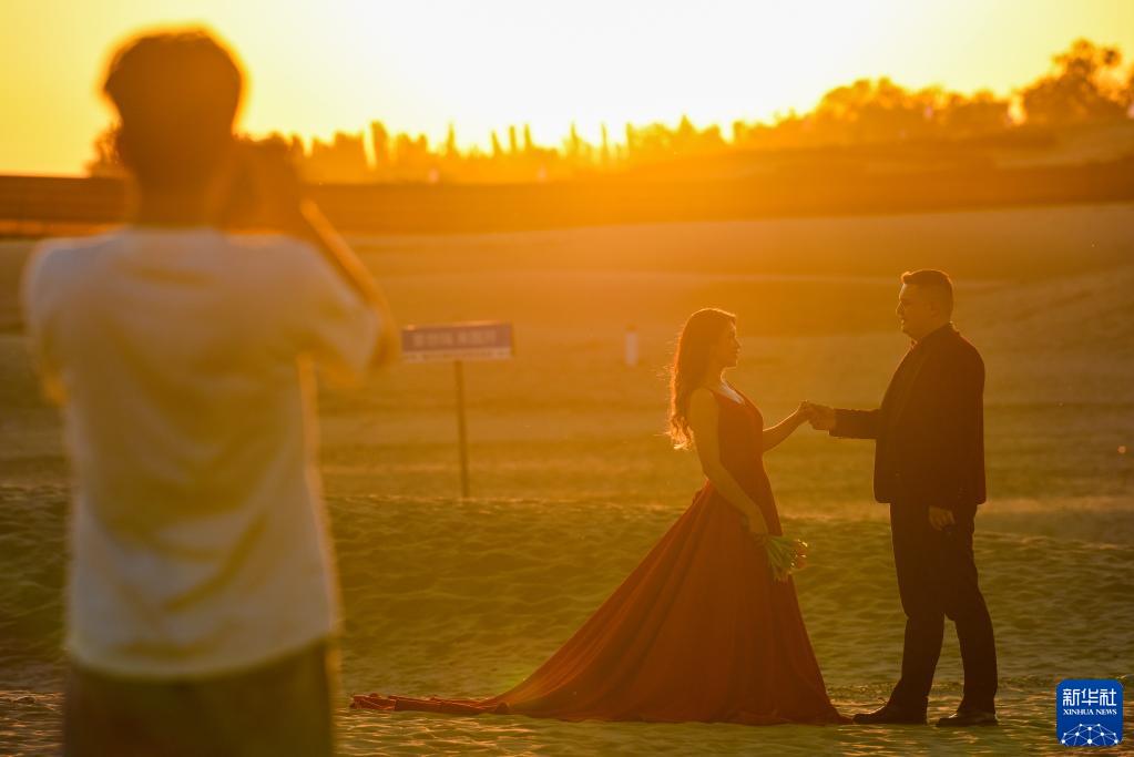 在新疆霍城縣圖開(kāi)沙漠,一對情侶在拍攝婚紗照(6月16日攝)。