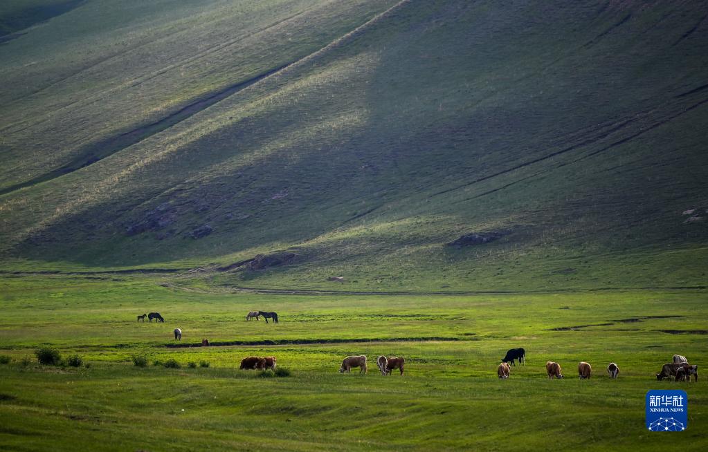 6月16日,在阿魯科爾沁旗巴彥溫都爾蘇木渾都倫游牧區,牲畜在草原上覓食。