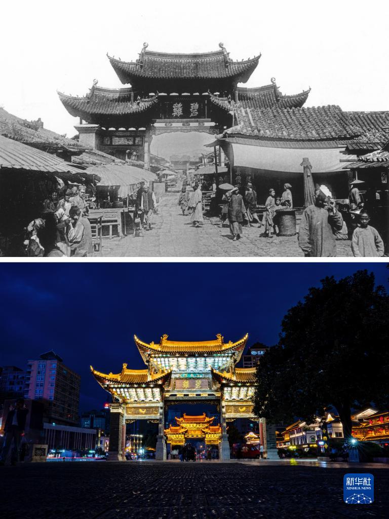 拼板照片:上圖為清末時(shí)期的昆明碧雞坊。(資料圖片 殷曉俊提供)