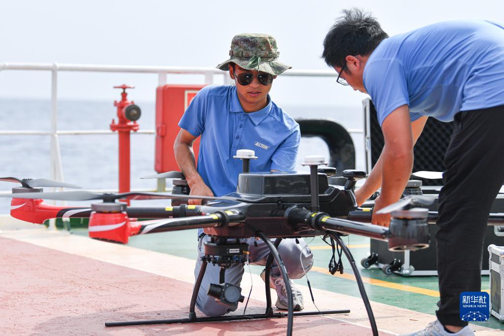 工作人員在“電科1號”綜合試驗船上調試無(wú)人機(6月15日攝)。