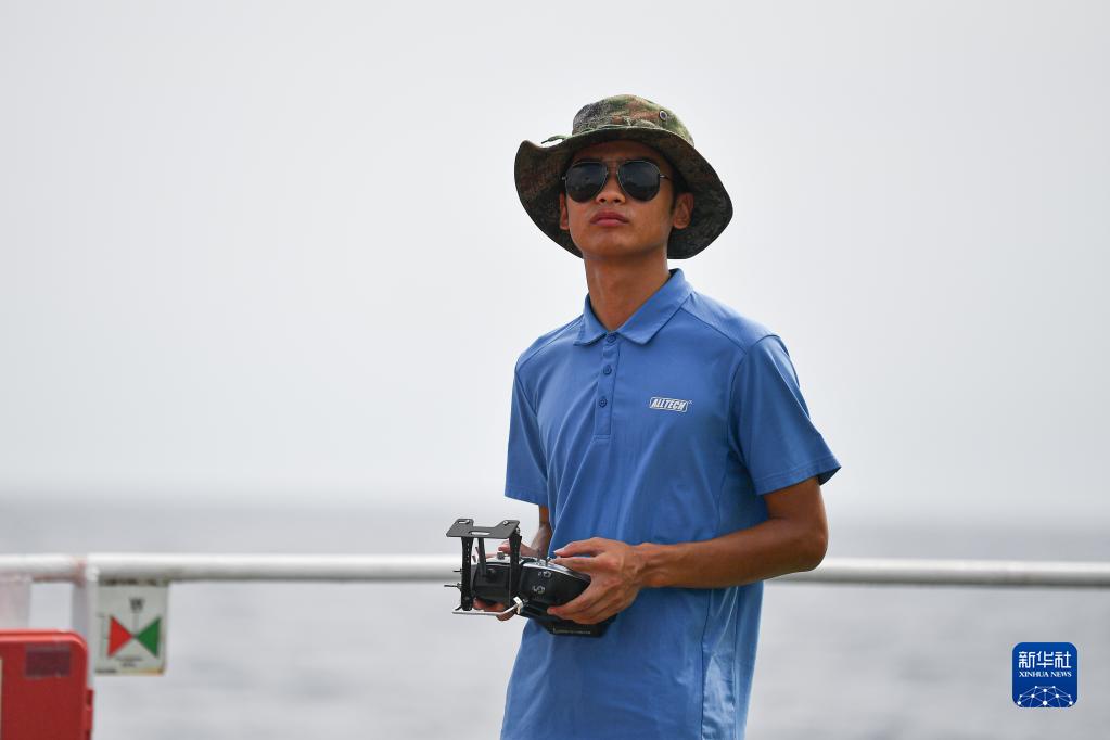 工作人員在“電科1號”綜合試驗船上操控無(wú)人機,配合此次遠海測試(6月15日攝)。