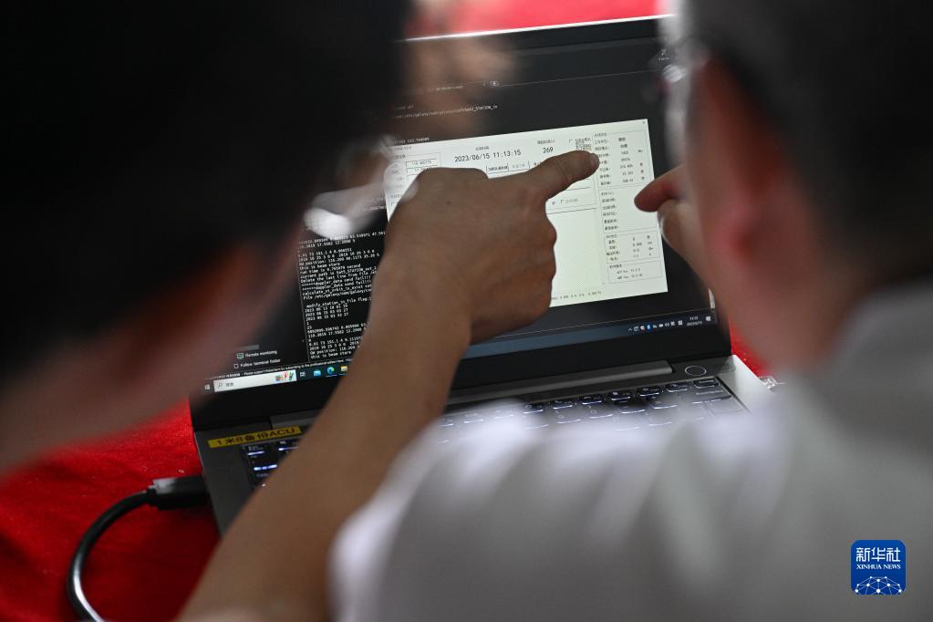 工作人員在“電科1號”綜合試驗船上驗證高低軌衛星、無(wú)人機協(xié)同通信覆蓋能力(6月15日攝)。