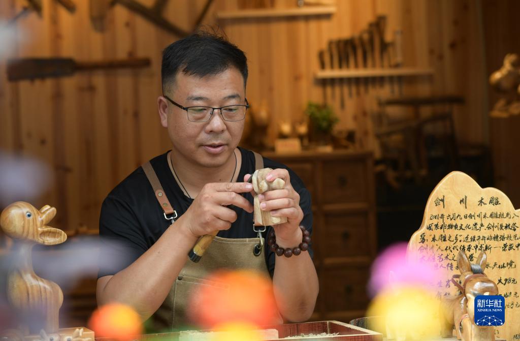 6月17日,一名手工藝人在貴州省鎮遠古城一家木雕店雕刻工藝品。