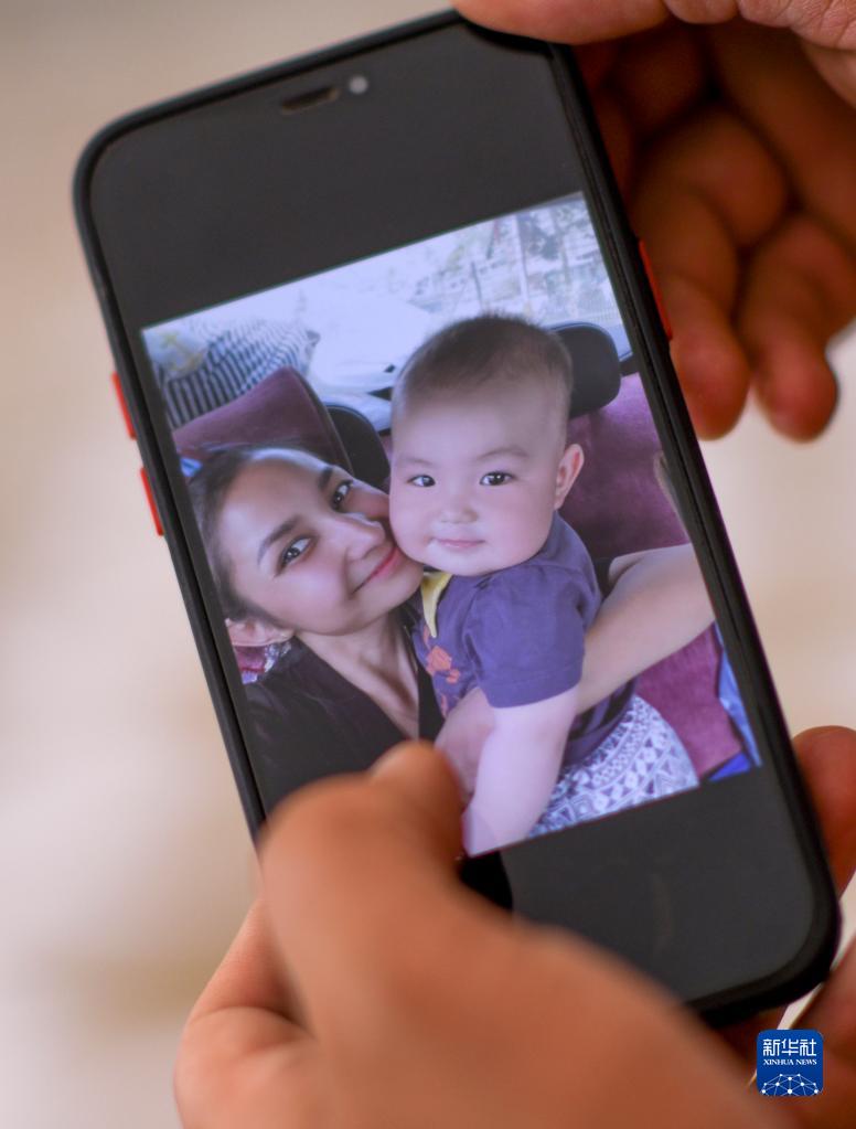 在中科院新疆生態(tài)與地理研究所策勒沙漠研究站,買(mǎi)爾當在翻看手機上妻兒的照片(6月13日攝)。新華社記者 王菲 攝